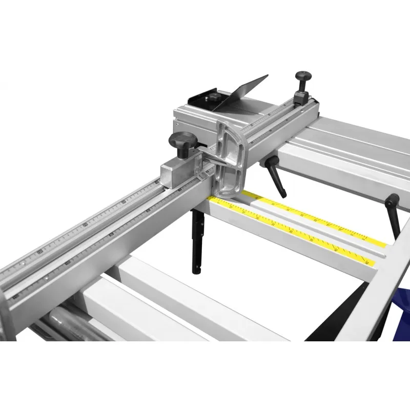 Scie à format Cormak PS12E-3000 avec table coulissante, lame de scie pivotante. Triphasé 400v, longueur de la table: 3000mm.  Lame de scie circulaire pivotante et réglable en hauteur avec unité de coupe.  Table en fonte grise avec rallonge de table à l’arrière et à droite avec pied d’appui.