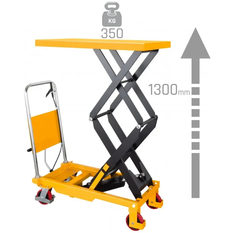 Table élévatrice double ciseaux mobile 350kg avec un hauteur de levage réglable de 400 à 1300mm. Système hydraulique renforcé pour un levage facile. La valve anti-surcharge empêche le camion de se surcharger.