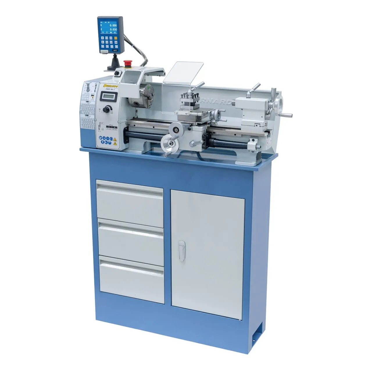Inclus dans la livraison: Indicateur digital 2 axes DT 40, mandrin 3 mors DK 11-100mm, tourelle 4 positions, forets de centrage, carter arrière, bac à copeaux, protection de mandrin, pignons interchangeables, indicateur digital de vitesse, outillage de service.